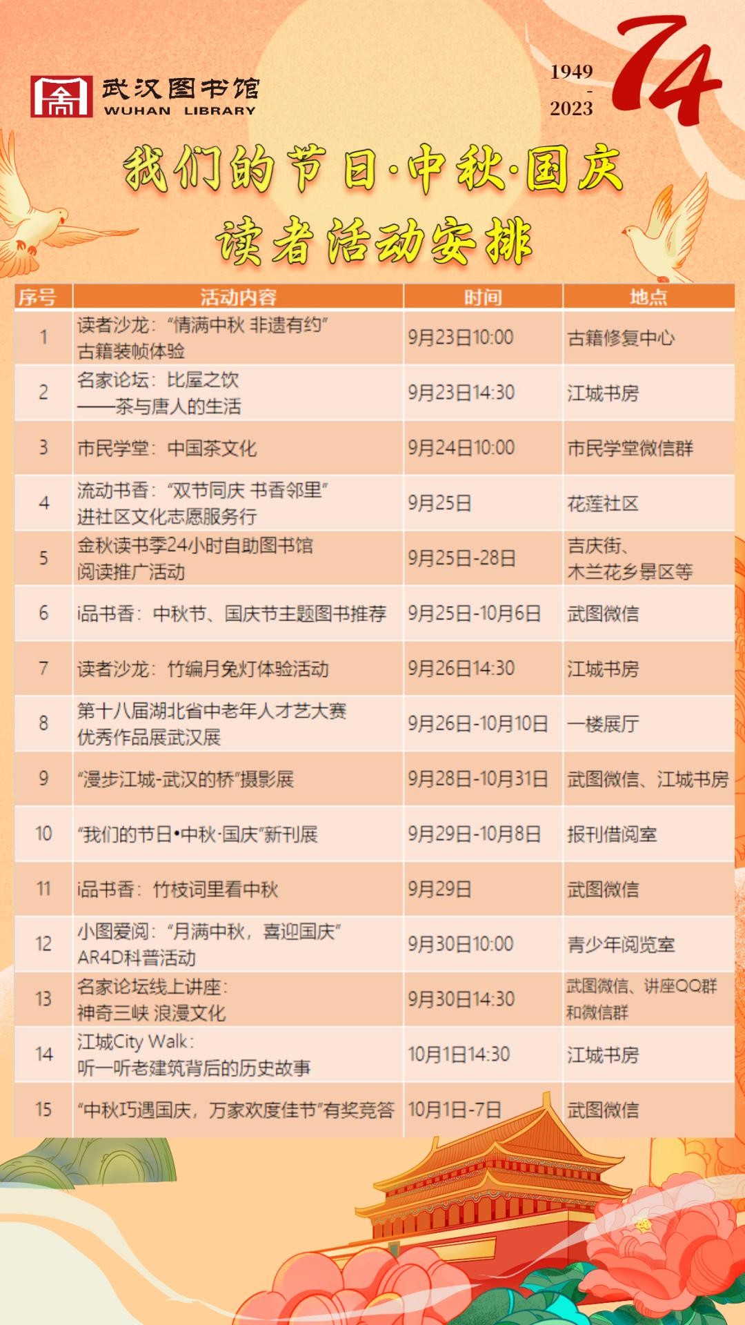 读者请注意!武汉图书馆发布中秋国庆开放时间及读者活动安排