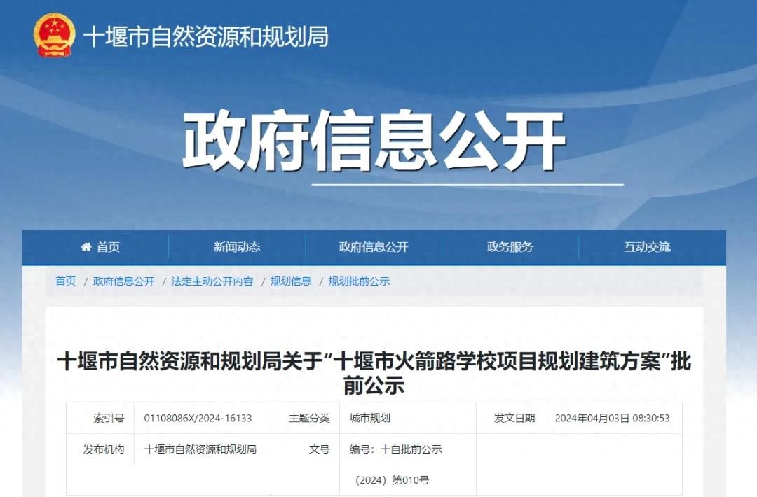 4月3日,十堰市自然资源和规划局公示火箭路学校项目规划建筑方案。