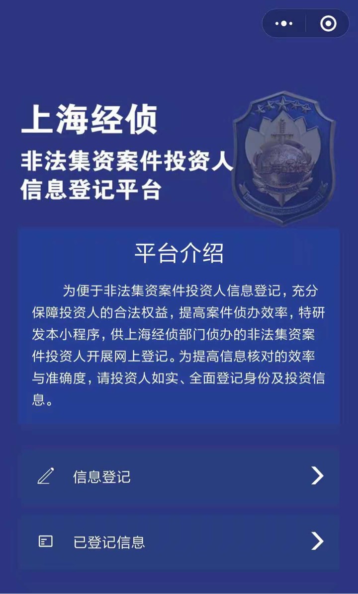根据案件侦办进展情况,公安机关正分批上线本市侦办的非法集资类案件,供投资人信息登记。投资人可通过手机访问上海市公安局官方微信公众号“警民直通车上海”,点击左下方“办事大厅”进入“服务大厅”界面,在“特色服务”中点击“投资人登记”图标,进入“上海经侦非法集资案件投资人信息登记平台”。
