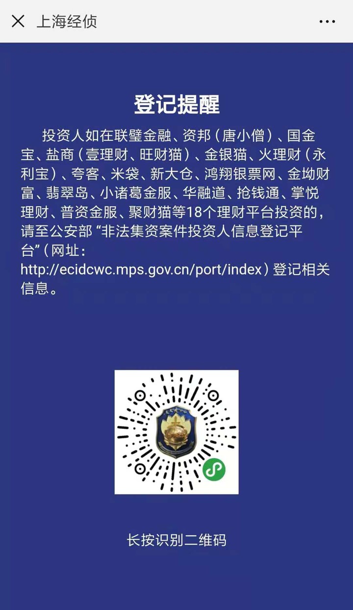 下一步,上海公安机关将及时更新本市非法集资案件网上登记内容。此前已列入公安部“非法集资案件投资人信息登记平台”(网址:http://ecidcwc.mps.gov.cn)登记的“联璧金融、资邦(唐小僧)、国金宝、盐商(壹理财、旺财猫)、金银猫、火理财(永利宝)、夸客、米袋、新大仓、鸿翔银票网、金坳财富、翡翠岛、小诸葛金服、华融道、抢钱通、掌悦理财、普资金服、聚财猫”等18个平台的投资人请继续至公安部平台登记信息。