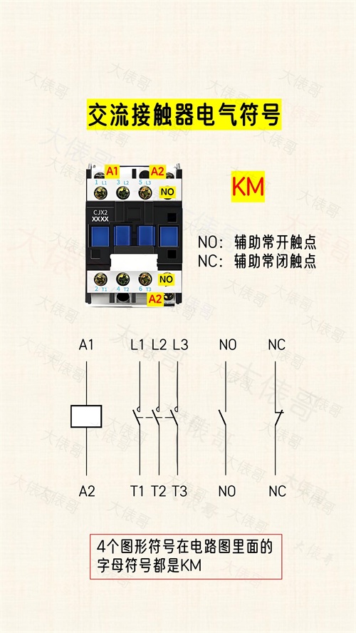 认识交流接触器的电气符号:字母符号是KM,图形符号有4个,如图所示,在电路图里的字母符号都是KM,这四个图形符号分别对应交流接触器的线圈、主触点、辅助常开触点、辅助常闭触点。