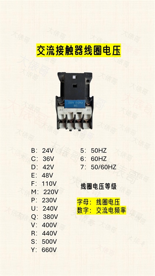 线圈电压有多种,接线的时候一定要注意看上面的标注。如图所示,字母对应线圈的电压等级,数字对应交流电的频率,比如我们常见的M5,就是接交流220V电源,Q5就接交流380V电源。
