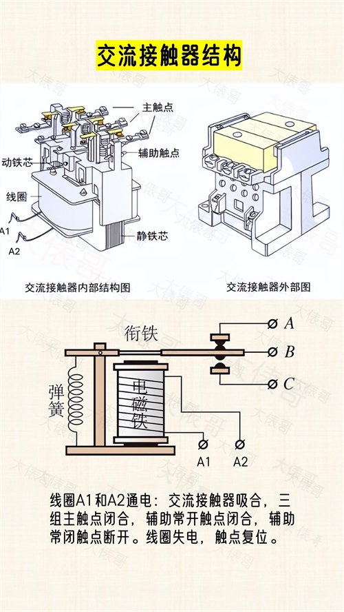 交流接触器的触点分为三部分:主触点、辅助触点、线圈触点A1和A2。