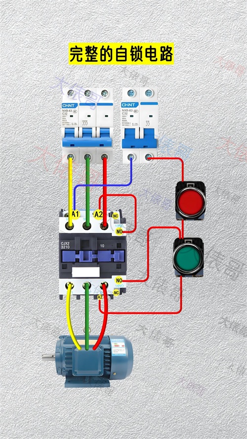 这就是最常见的自锁电路,也是最普遍应用的电动机的启停控制,也叫起保停电路。需要用到接触器的辅助常开触点,接线技巧:把启动按钮的常开触点和交流接触器的辅助常开触点并联,接触器吸合,辅助常开触点闭合。通过自身的辅助常开点持续给线圈供电形成自锁,按下红色停止按钮,接触器失电。