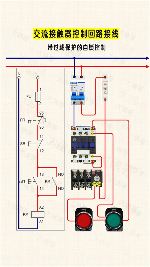 这个是带过载保护的自锁电路,增加了一个热过载继电器。接线技巧:把热过载继电器的常闭触点95-96串联到控制回路中,电动机过载时,95-96断开,控制回路失电,然后主回路也会断电。