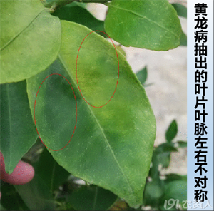 同时有的叶片还可以清晰地看到抽出的叶片的叶脉左右不对称。以上呢就是咱们黄龙斑驳黄化型叶片的一个表现。