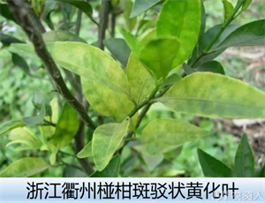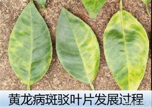 黄龙斑驳黄化型:叶片表面起蜡,光滑,脆硬,(正常的柑橘叶片攥在手里再松开会恢复原状,得了黄龙病的叶片就会碎掉,像塑料片一样)叶基和叶缘,叶脉先变黄,慢慢像叶子其他地方发展,黄绿相间,形成斑驳。