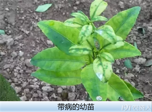下面这张图,很多人应该不陌生,这是砂糖橘的黄龙病、贡柑的黄龙病、带病的幼苗,可以看到叶片出现了整个的黄化。