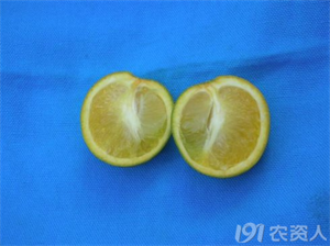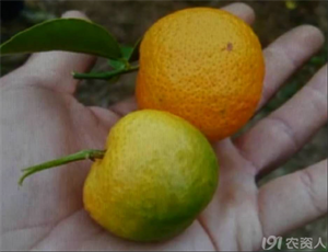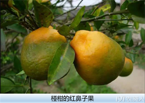 果实着色异常,上色少或者不上色出现青果,果小,畸形,落果,果实中心柱不正,果实品质变差。果肉常常局部不成熟,酸味儿重;具体的表现情况大体有几种“红鼻子果”、“青果(甜橙)”或“青头果(南丰蜜橘)”,“不熟果(广东沙糖橘)”。接下来看一下图片: