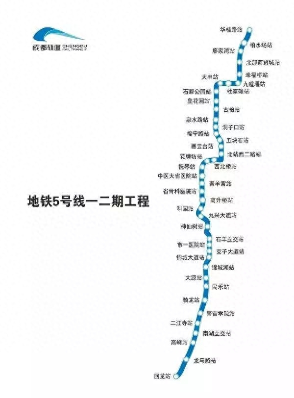 工程北起新都区香城大道南侧华桂路站,向南止于回龙站。线路全长49.02公里,共设车站41座,其中地下站36座,高架站5座。5号线一二期全线41座车站主体结构已全部封顶,于2025年12月28日实现全线轨通。预计今年年底前开通。