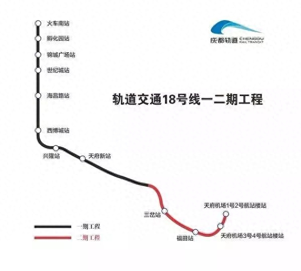 18号线一二期为成都天府机场线,起于火车南站,止于天府机场1、2号航站楼。线路全长约66.8km,共设置11座车站,是成都市第一条采用PPP模式投资建设的轨道交通项目。一期工程为火车南站~龙泉山隧道出口,线路长约41.2km,设8座车站,均为地下站;二期工程为太平隧道~天府机场1、2号航站楼站,线路长约25.6km,设4座车站。该线路预计2025年完工。