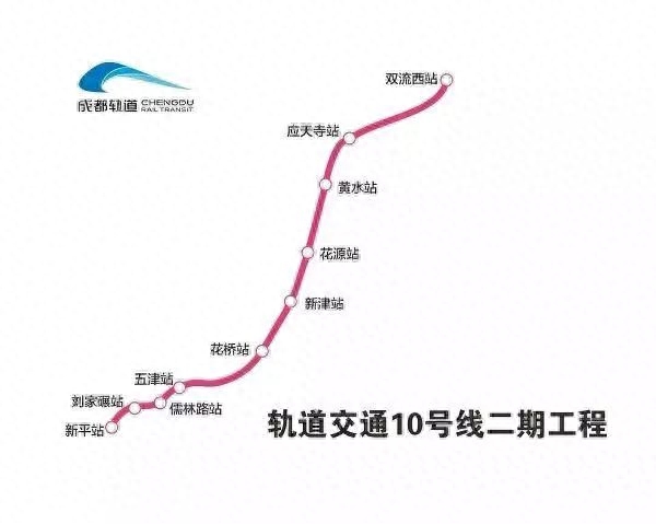 10号线二期起于双流西站,止于新平站。该线作为成都市市域快线之一,主要服务于主城与新津组团的快速联系,并兼顾服务双流机场客流。全长27.04km,共设车站10座,其中地下站5座,高架站5座。该线路预计2025年开通。