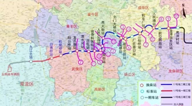 17号线一期(含19号线一期)始于金星站,止于机投桥站。工程线路长26.145km,其中高架段长约5.5km,过渡段长约0.5km,地下段长约20.1km,共设车站9座(8座换乘站),其中高架站2座,地下站7座,设永义车辆段及五桐庙停车场。该线路预计2025年完工。