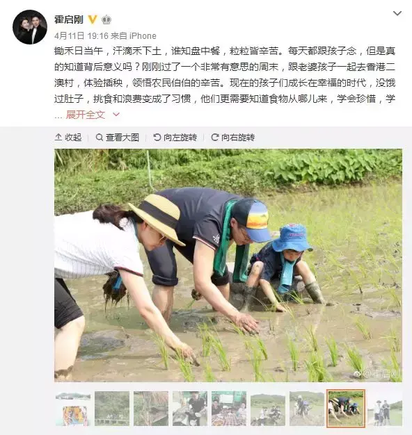 前不久,他还带着老婆孩子一起去乡下,体验插秧,目的就是为了让孩子能够真正领悟农民伯伯的辛苦。