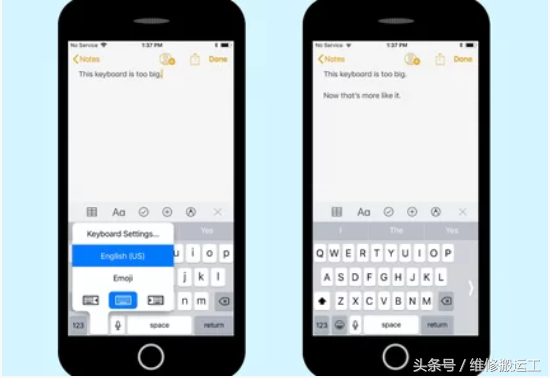 iPhone 8和8 Plus是相当大的手机 - 它可能是一个单手打字的困难,特别是如果你的拇指不能到达屏幕的另一边。iOS 11中的一个新功能通过将键盘挤压到屏幕的一侧使得这更容易。点击并按住表情符号图标,然后选择替代键盘列表下方的左侧或右侧图标,您将进入单手打字模式。点击键盘的空面将其扩展回正常宽度。