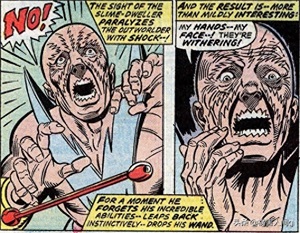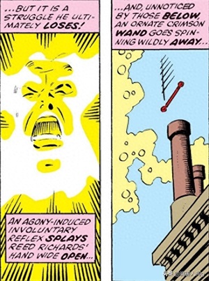 他在与神奇四侠的战斗中占据上风,因而抬头哈哈大笑,石头人趁机扔出一块泥巴打飞了他手中的魔法棒,他就迅速的衰老,很快就变成了一堆枯骨。
