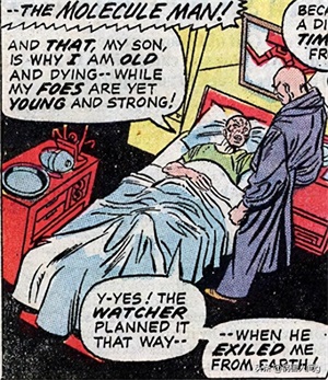 在分子人被神奇四侠击败后,观察者乌阿图将分子人带走,囚禁在了另一个维度。这个维度时间流逝的速度非常快,很快分子人就开始衰老。