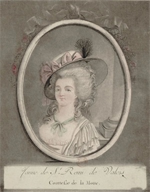 让娜·德瓦卢瓦·圣雷米的祖父其实是亨利二世未被合法化的私生子,后来这位私生子被封为男爵,但是到让娜这一代家产基本上被挥霍的一干二净,没办法的让娜只能来到巴黎谋生,在此期间让娜染上了一系列的恶习,专门干偷摸拐骗的勾当,然后去挥霍。但是好在让娜长得漂亮,很有男人缘,所以在1780年嫁给了法兰西国王卫队长尼古拉德拉莫特伯爵,摇身一变成为了伯爵夫人,终于不用漂泊流浪了,但是挥霍惯了的让娜在结婚后丝毫没有收敛,结交了不少的情夫不说,还到处挥霍享乐。夫妻两人基本上是各过各的。很快自己的财力根本就支撑不了多久,于是让娜将目光放在了那枚价值200万法郎的项链上。