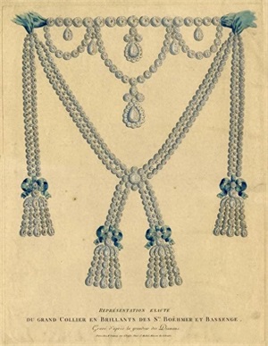 原本想靠这条项链大赚一笔的珠宝商彻底傻眼了,于是这位珠宝商找到了玛丽王后,表示想要继续完成这条项链献给王后,但是在玛丽还是王储妃的时候就和杜巴利夫人势同水火,所以当即表示不会接受杜巴利夫人有关的任何东西,再加上这枚项链的价格实在是太贵了,所以将珠宝商赶了出去。但是这一幕很快就被一位名叫让娜·德瓦卢瓦·圣雷米的女人知道了,于是在让娜心底一个惊天阴谋浮现了出来。