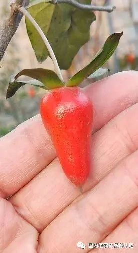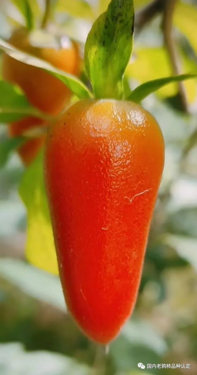 天骄作为国内老鸦柿品种,其品种特征:果为辣椒型,似朝天椒,颜色大红,果子比较大(长度约3—4厘米),萼片微微上翘,相对于果子,果柄稍长,粗度适中,转色为青转黄转橙转大红,有少量的斑点。