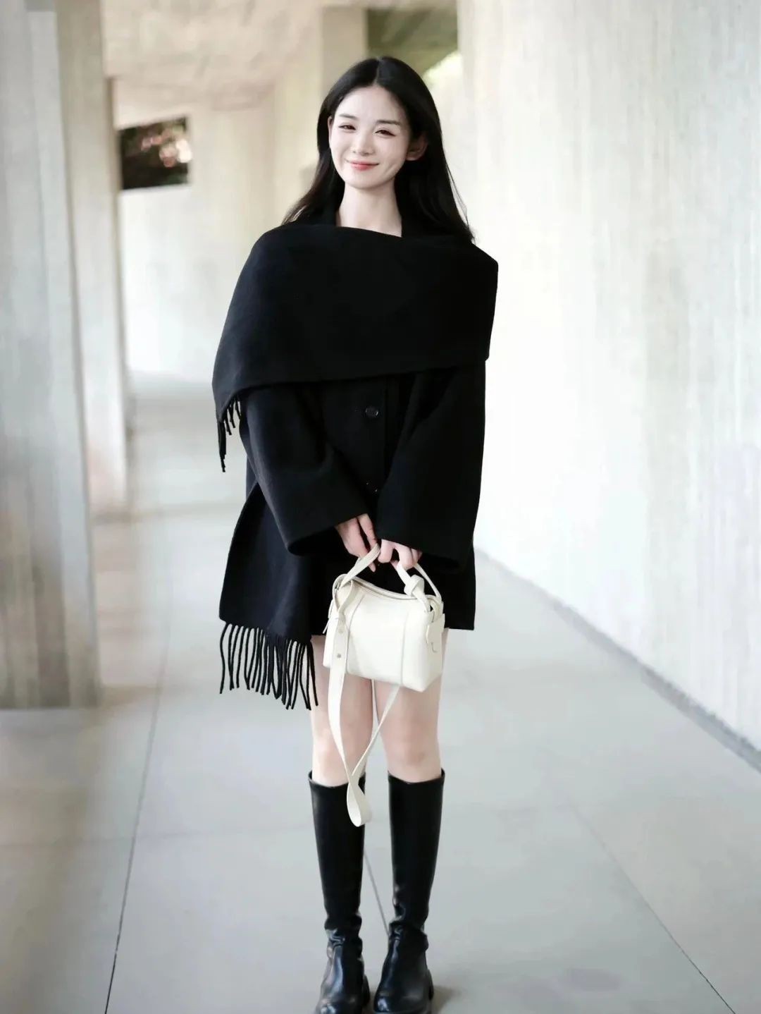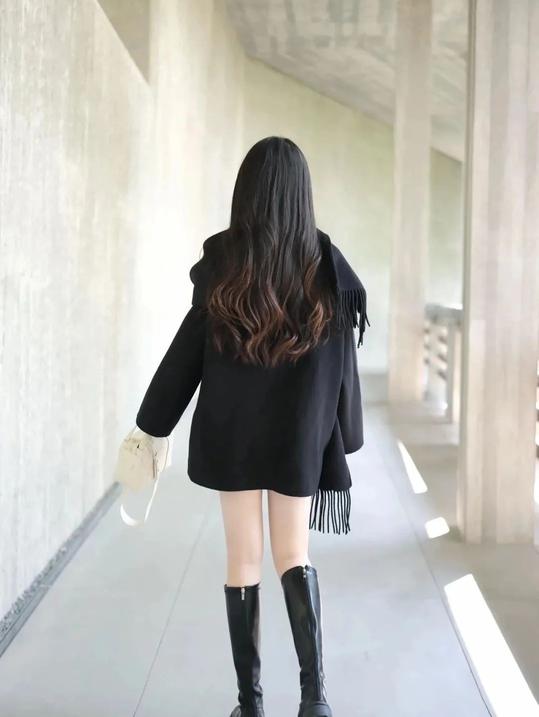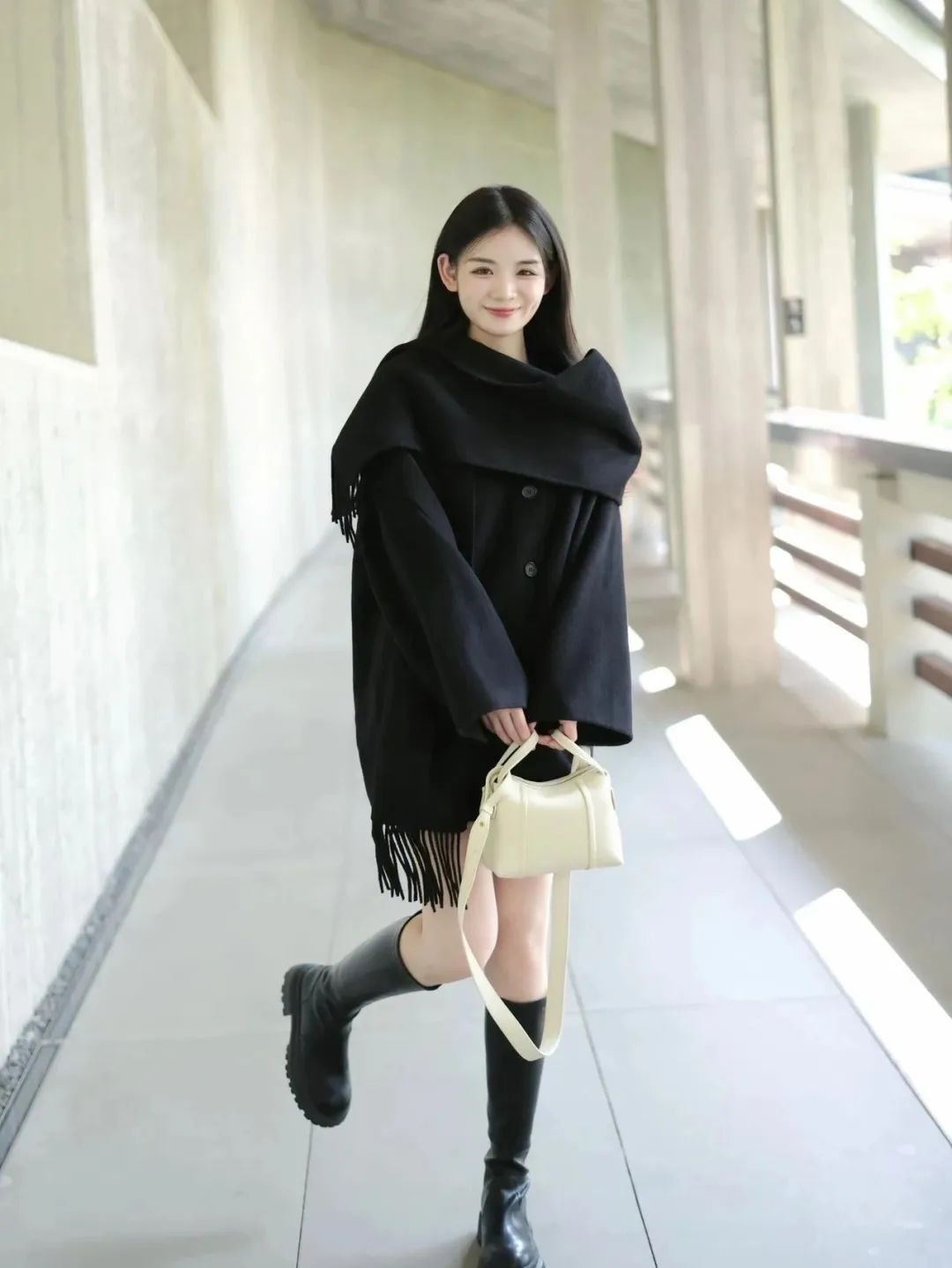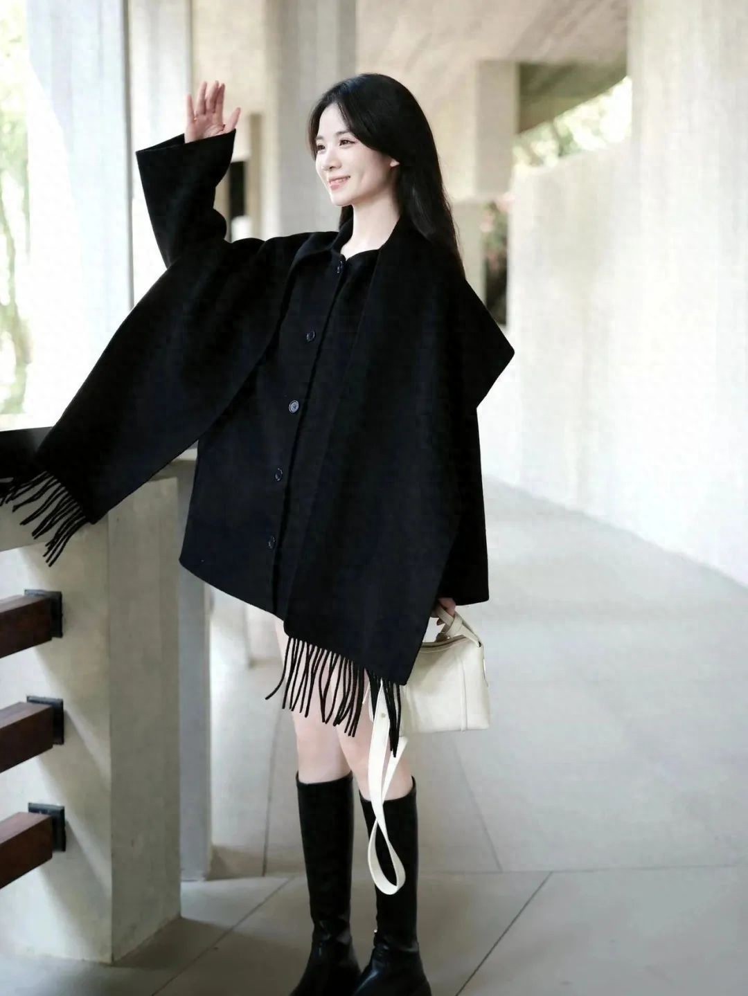 当一件剪裁精良的黑色大衣遇上酷劲十足的黑色长靴,瞬间碰撞出干练又不失优雅的火花!这种搭配,简直是行走的时尚教科书,让人忍不住多看几眼。