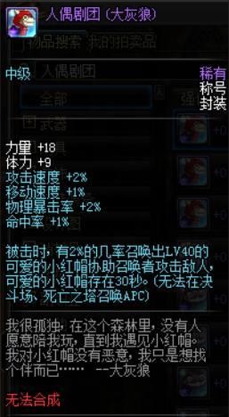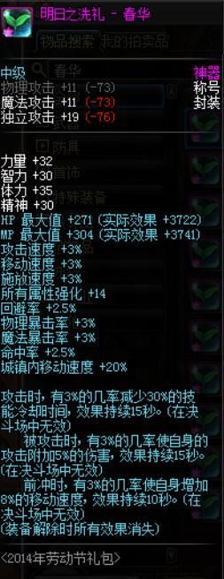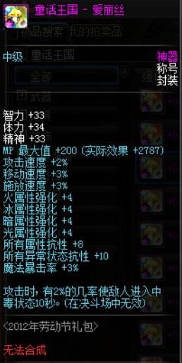 2012年五一称号首度加入了属强属性,不过副属性的这个中毒状态完全没卵用,当年这个礼包一套给两个称号,赠送的童话王国白金版属性倒还不错,装备时可以增加力量和智力。