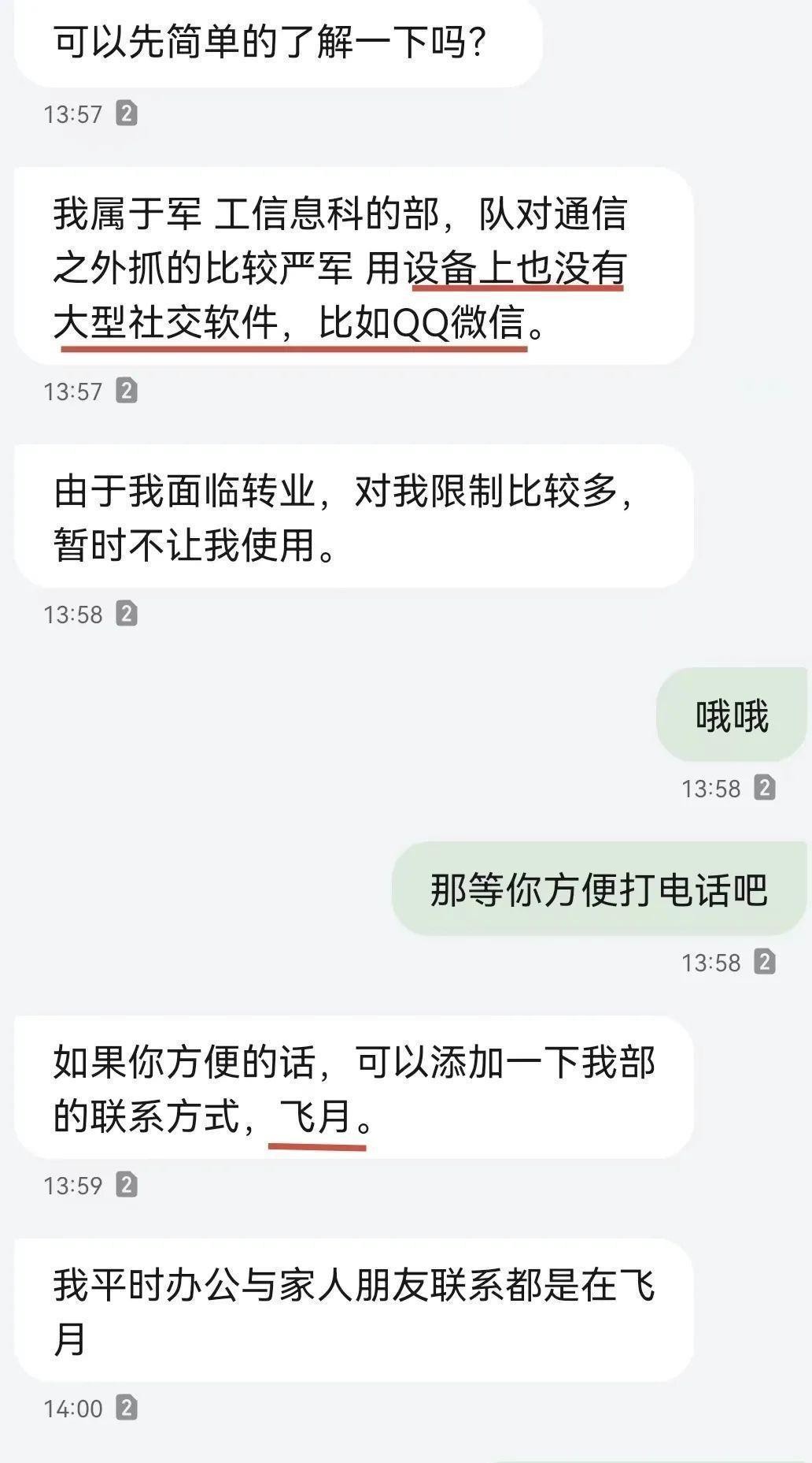 这名男子一开始就告诉女网友自己即将转业,让她下载一个叫“飞月”的社交软件进行沟通。