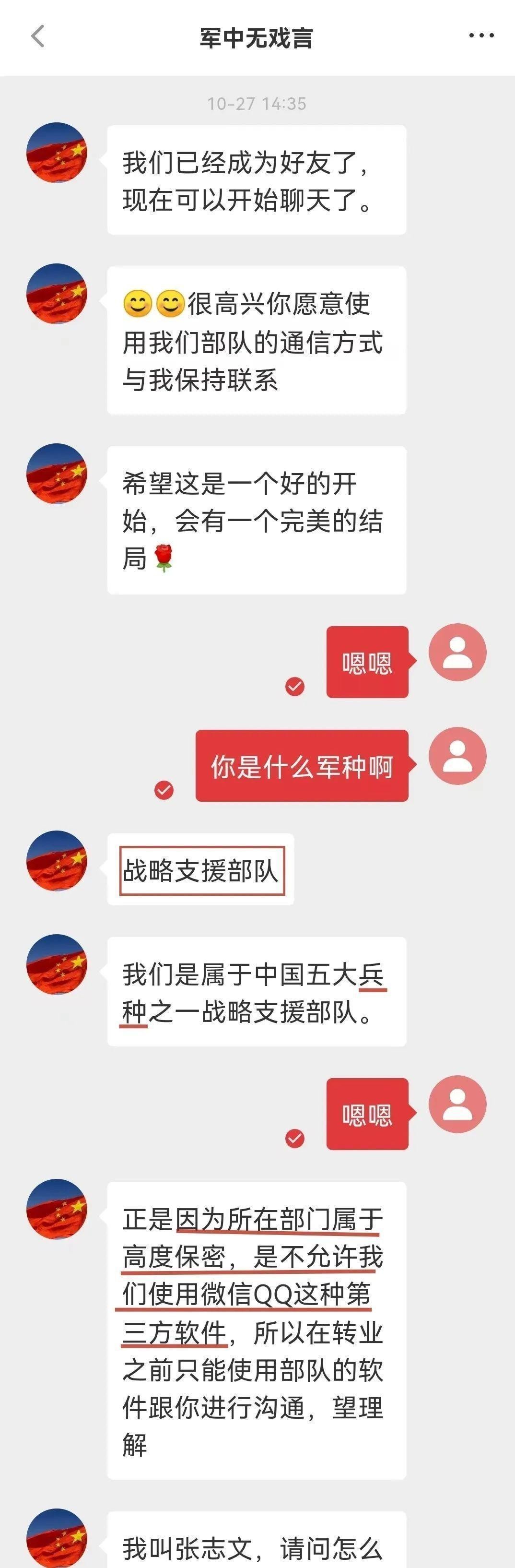 从一个乌海军分区的工作单位变成了战略支援部队,为了让女网友相信他的身份,