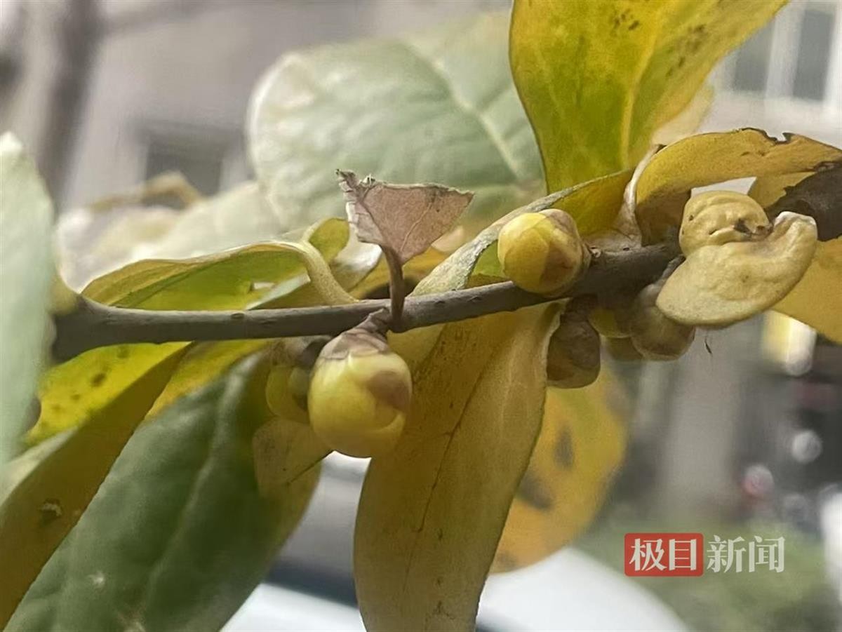 蜡梅是先叶后花。极目新闻记者走访武汉几个公园和小区发现,目前蜡梅叶片尚未凋落,有的蜡梅叶片仍保持着绿色,不过枝头的蜡梅已初开了,枝条中部结满了花苞,处于含苞待放的状态,再过一周花开更多,香味更浓郁。