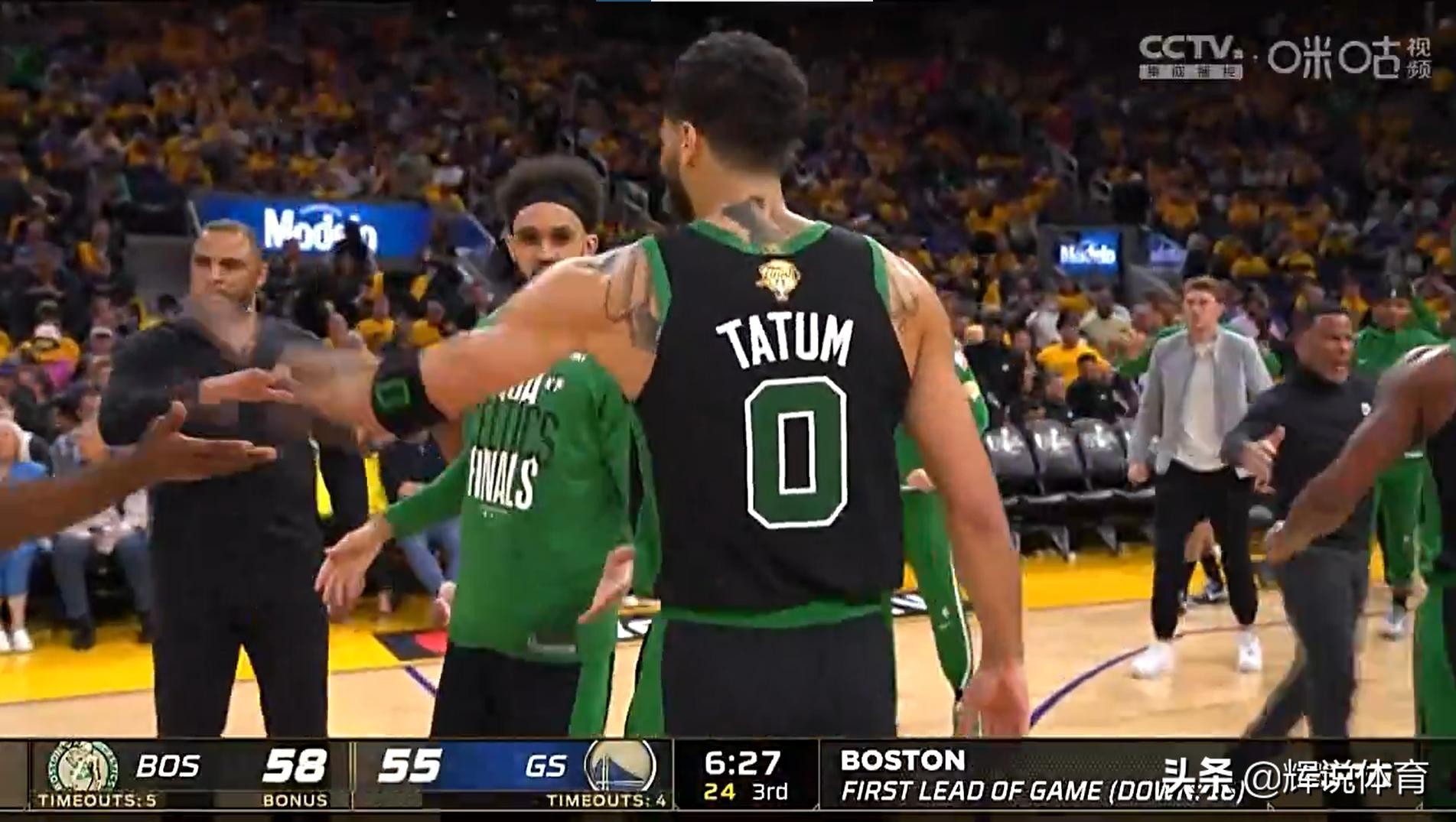 上半场勇士队发挥出色取得51-39领先,第三节一上来,塔图姆、斯玛特连续投进3分,凯尔特人反超比分,汤普森和普尔也在三分线外给予回应,普尔压哨三分打进,三节打完勇士队75-74领先一分。