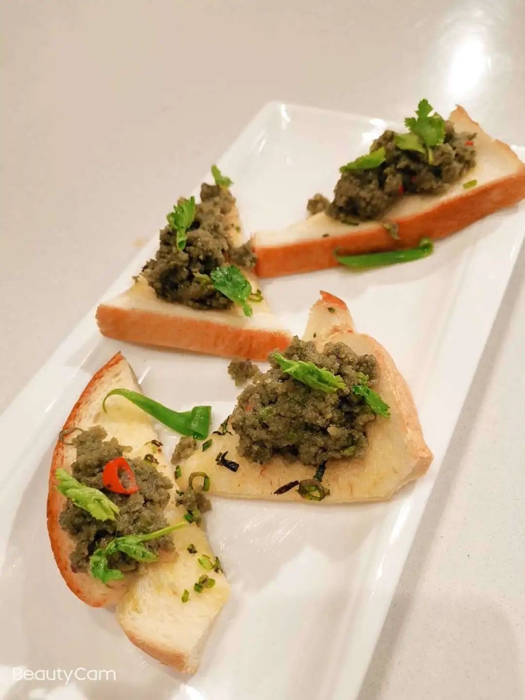 将皮蛋放置打碎机内打碎,加入小米椒,醋,蒜,盐等调味,吐司面包片随意切成小片状,锅内放黄油蒜,香菜碎和盐胡椒粉,烧至上色将面包片放入,面包片煎至脆香上色取出,把打好的皮蛋茸放在煎脆的面包片上装饰即可