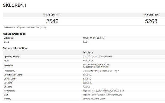 在GeekBench数据库上出现了一款搭载Intel Core i7-6567U处理器、6GB DDR31600内存的笔记本电脑,运行Mac OS X 10.11.3系统,尽管型号为SKLCRB1,1看起来像苹果MacBook的编号,但MacRumors表示主板号显示为MacBookPro8,1,这是2011款13英寸MacBook Pro的型号,所以现在这台只是黑苹果电脑。另外该黑苹果电脑单核2546和多核5268的跑分成绩,要比现款搭载Intel Core i7-5557U的高配MacBook的成绩要低不少,后者可以跑到单核3099和多核6477分。