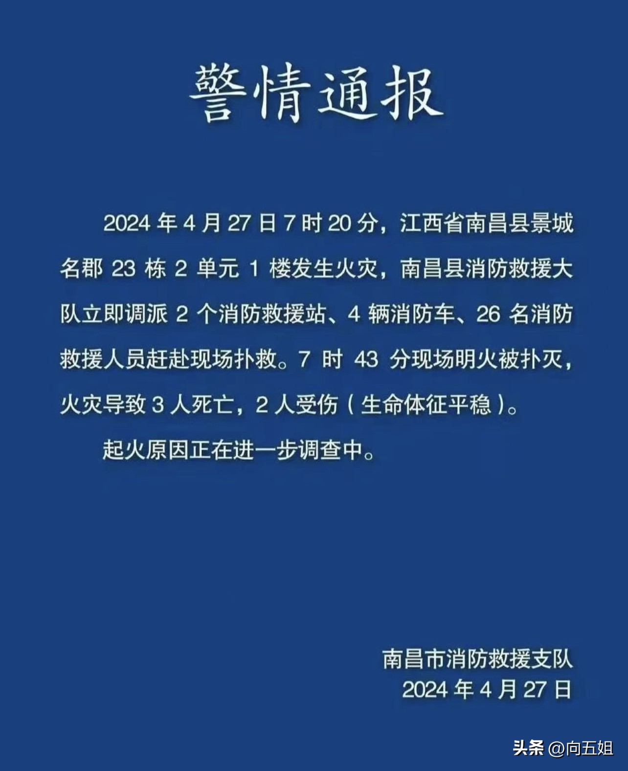 2024年4月27日,江西省南昌市南昌县景城名郡小区发生火灾,造成3人死亡、2人受伤。其中一美女烧成黑人,成功脱险,目前起火原因官方还未公布。