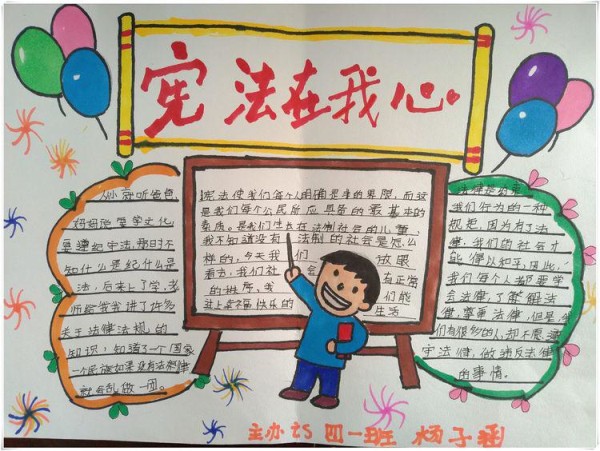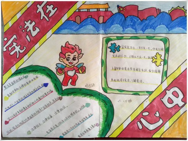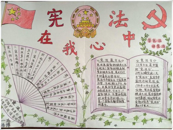 此次通过宪法手抄报和黑板报的比赛活动,让广大学生再次了解《宪法》是我国的根本大法和宪法的主要内容,以及公民履行宪法规定的权利和义务。同时,号召青少年学生要自觉做到:尊法、学法、守法、用法,处处依法;要自觉遵守《学生日常管理规范》及学校的各项规章制度;要尊敬老师,团结同学,刻苦学习,积极进取,全面发展;要诚实守信、热爱劳动、爱护公务、保护环境。要让宪法真正落实到每位学生的一言一行之中,更铭记在同学们的心中。