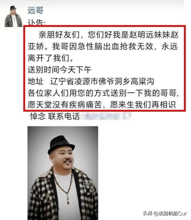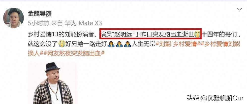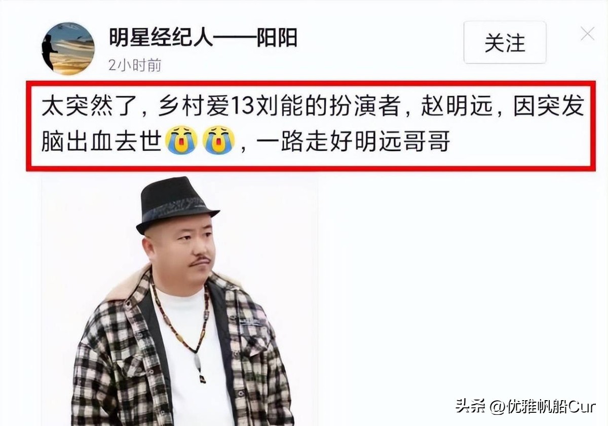 演艺圈再度惊叹,赵明远,即《乡村爱情》中刘能角色的扮演者,不幸因急性脑出血突然离世,年仅42岁。这位替代了经典角色的演员,十四年的友情就这样戛然而止。不久前,他还在朋友聚会上精神饱满,生命无常,令人唏嘘。