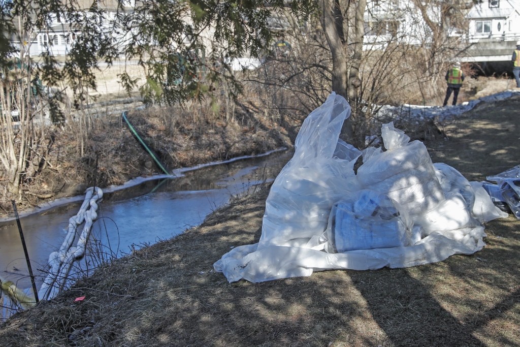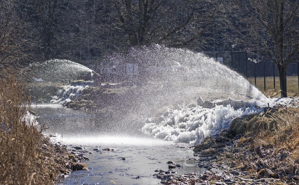 当地时间2023年2月18日,美国俄亥俄州东巴勒斯坦,俄亥俄州列车脱轨致有毒气体扩散事件持续发酵,工作人员过滤小溪中的水源。