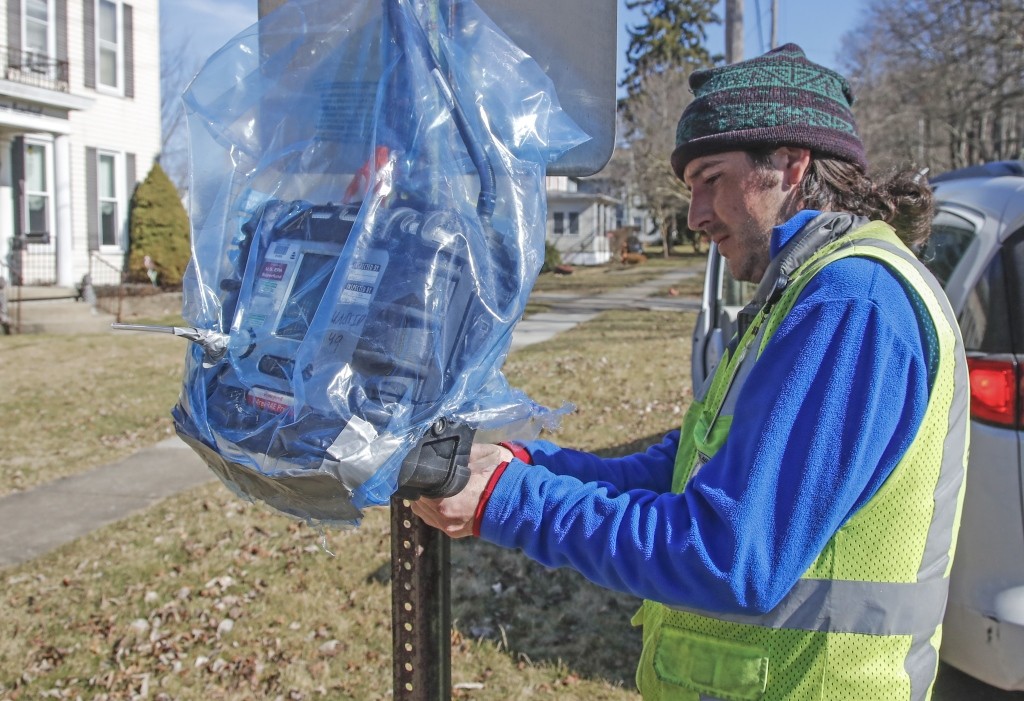 当地时间2023年2月18日,美国俄亥俄州东巴勒斯坦,俄亥俄州列车脱轨致有毒气体扩散事件持续发酵,工作人员检查空气质量采样器。
