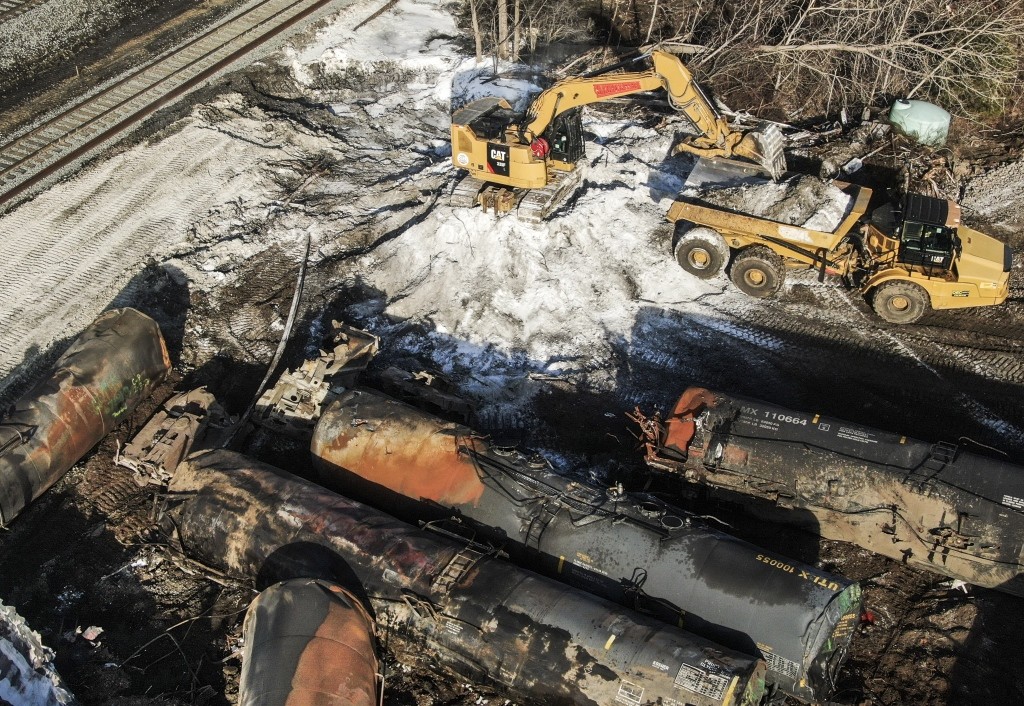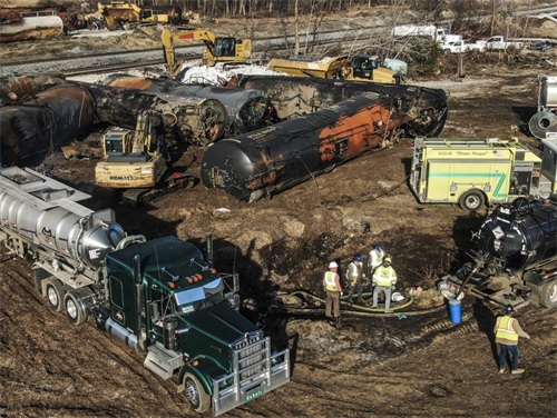 当地时间2023年2月18日,美国俄亥俄州东巴勒斯坦,俄亥俄州列车脱轨致有毒气体扩散事件持续发酵,现场清理工作持续进行。