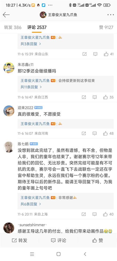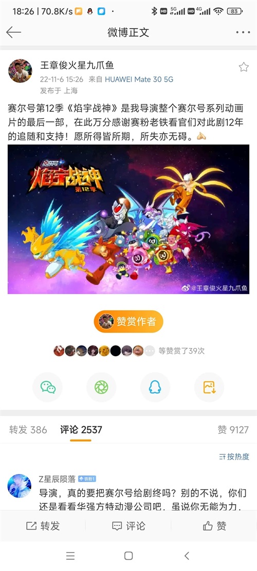 就在11月7日下午三点左右,赛尔号第12季焰宇战神的导演王章俊发布了赛尔号的最终季,也透露出了赛尔号的制作团队已经解散,这些消息一出让很多零零后都觉得非常突然,大家纷纷去到导演的帖子下评论,大家都希望赛尔号能出一个圆满的结局来结束我们的童年记忆。