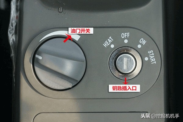 发动机启动开关,其实就是插入钥匙启动挖掘机的位置。上面有一些标识: