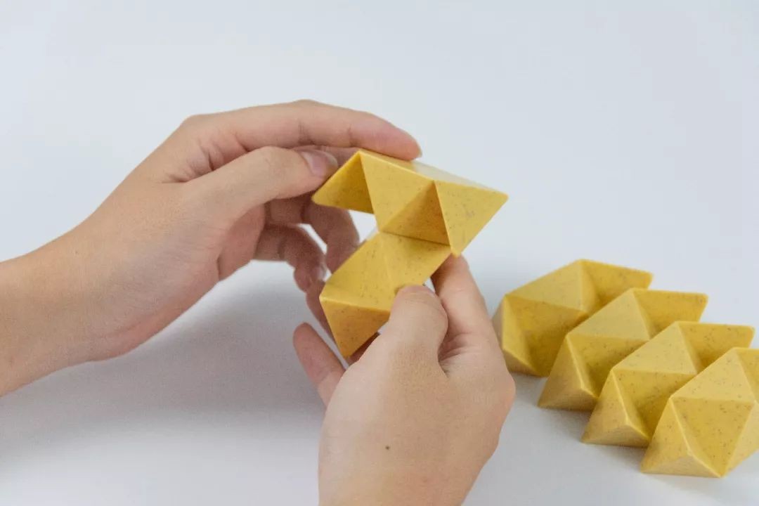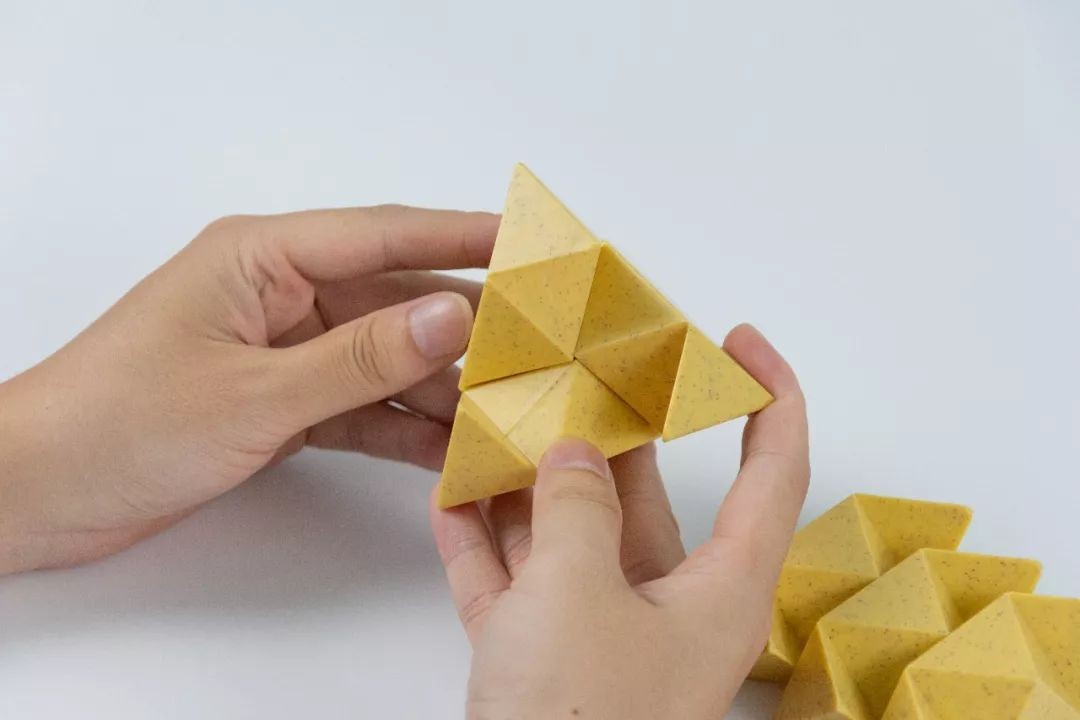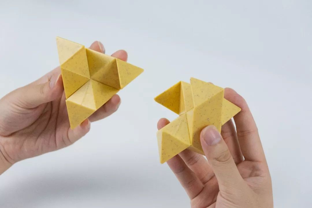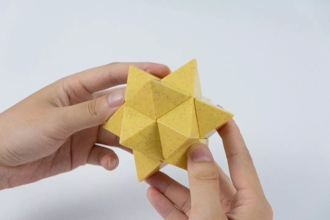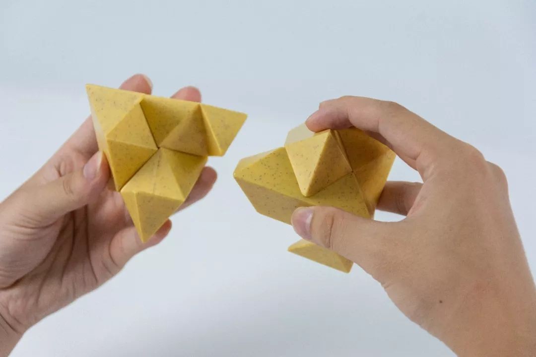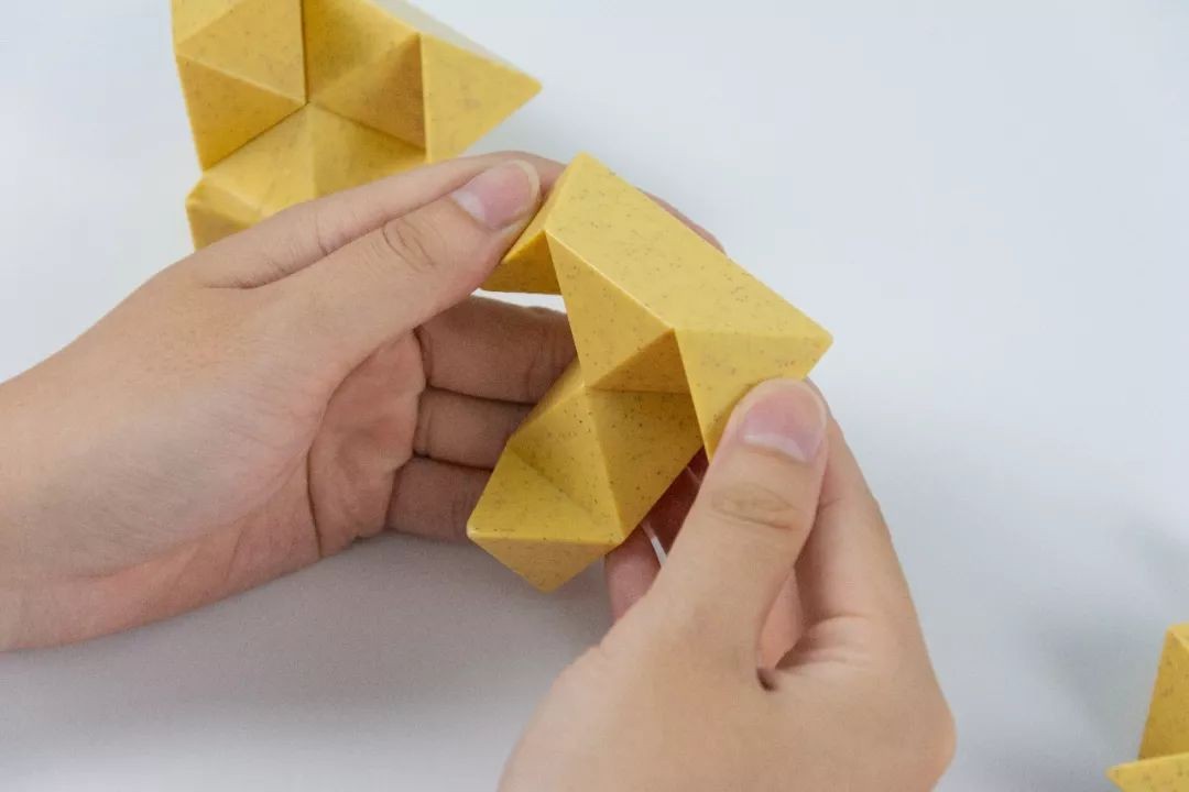 拿起来第三根孔明锁,在前面组装起来的孔明锁上,往左或右侧的缺口插入,形成上图的造型
