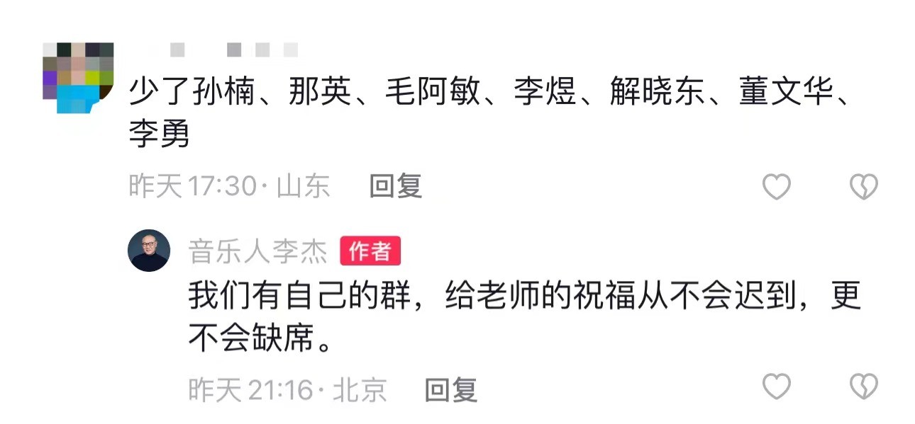 正当大家不解和疑惑的时候,谷建芬的好学生李杰,则在网友的留言下面,认真解释说,“他们有自己的群,给老师的祝福从不会迟到,更不会缺席。”