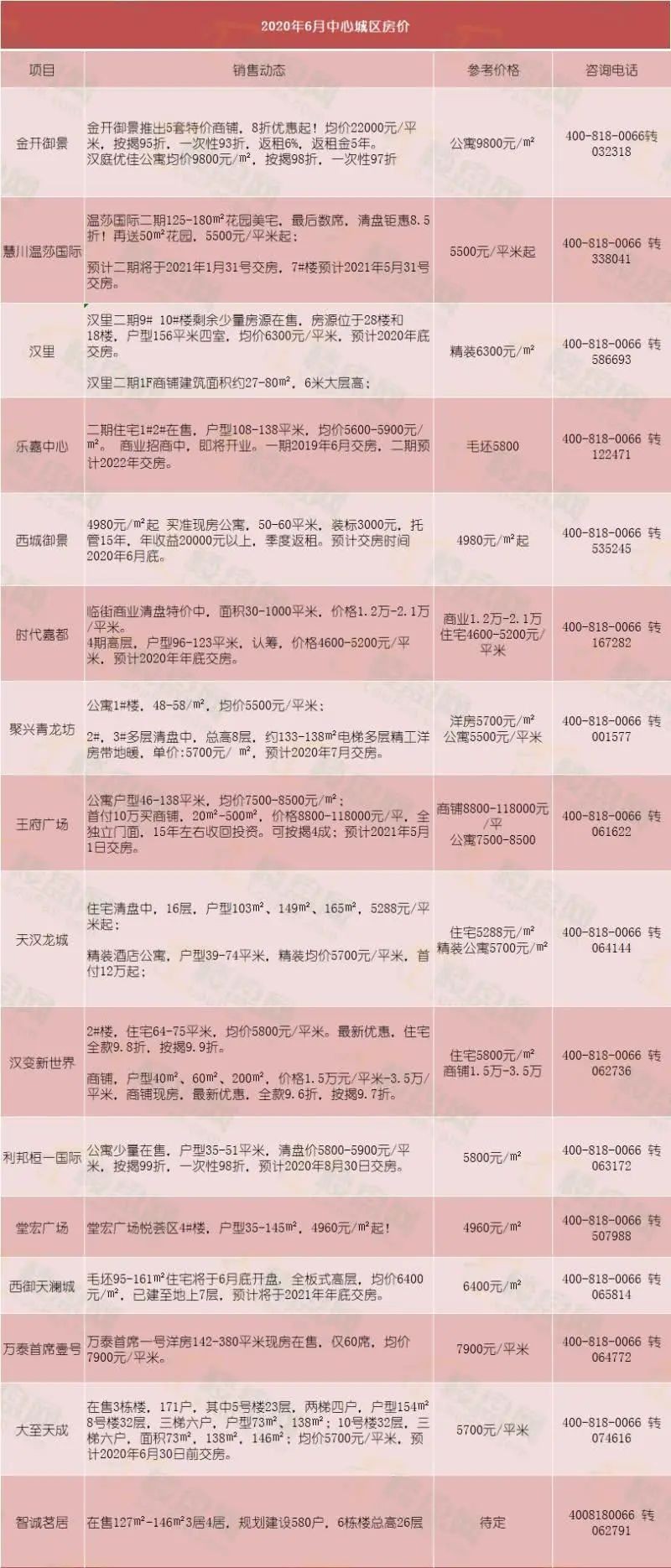 中心城区温莎国际二期、天汉龙城住宅清盘中,乐嘉二期住宅在售,其余多为公寓及商业在售。