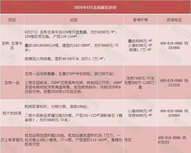 龙岗新区2020年将有汉上桃李春风项目将在6月售楼处开放,首推4栋小高层,区域在售的仅有恒大悦珑湾、圣桦龙湾半岛和龙岗一品,龙岗一品洋房产品已售罄,在售的都是顶级改善型别墅产品;圣桦龙湾半岛也到推盘尾声,恒大悦珑湾推出二期精装小高层在售,均价6800元/㎡。
