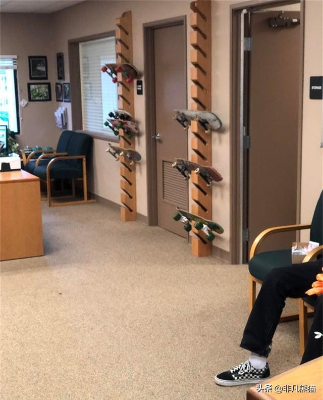 23 学校教室门口的两边放置了两个长长的架子,是为那些滑板来上学的孩子设计的,专门用来存放滑板。