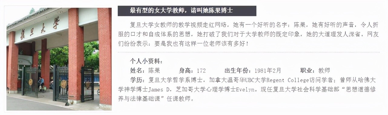 陈果老师,出生于1981年,是典型的80后。身高172厘米;复旦大学哲学系博士,目前仍旧是复旦大学社会科学基础部,马克思学院的一名任课老师。