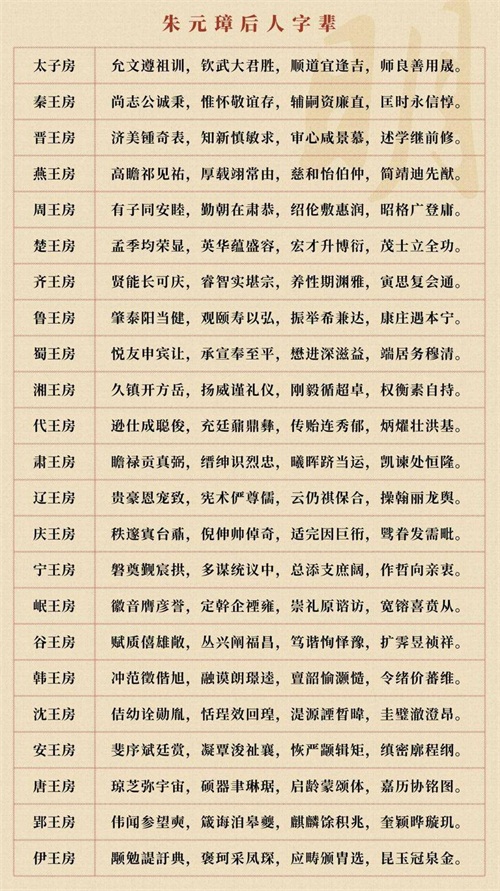 五行相生:部分家族遵循五行相生的古老原理确定字辈。明朝朱元璋为其后代所订字辈极具代表性,除规定使用特定字辈外,名字的第三个字还得按五行相生顺序选取偏旁。从他的儿子辈以木字旁为始,孙子辈起依火、土、金、水顺序循环,这一独特规定,既体现古人对自然规律的尊崇,又在家族传承中形成别具一格的命名体系,让家族成员名字蕴含深厚文化内涵与神秘色彩。