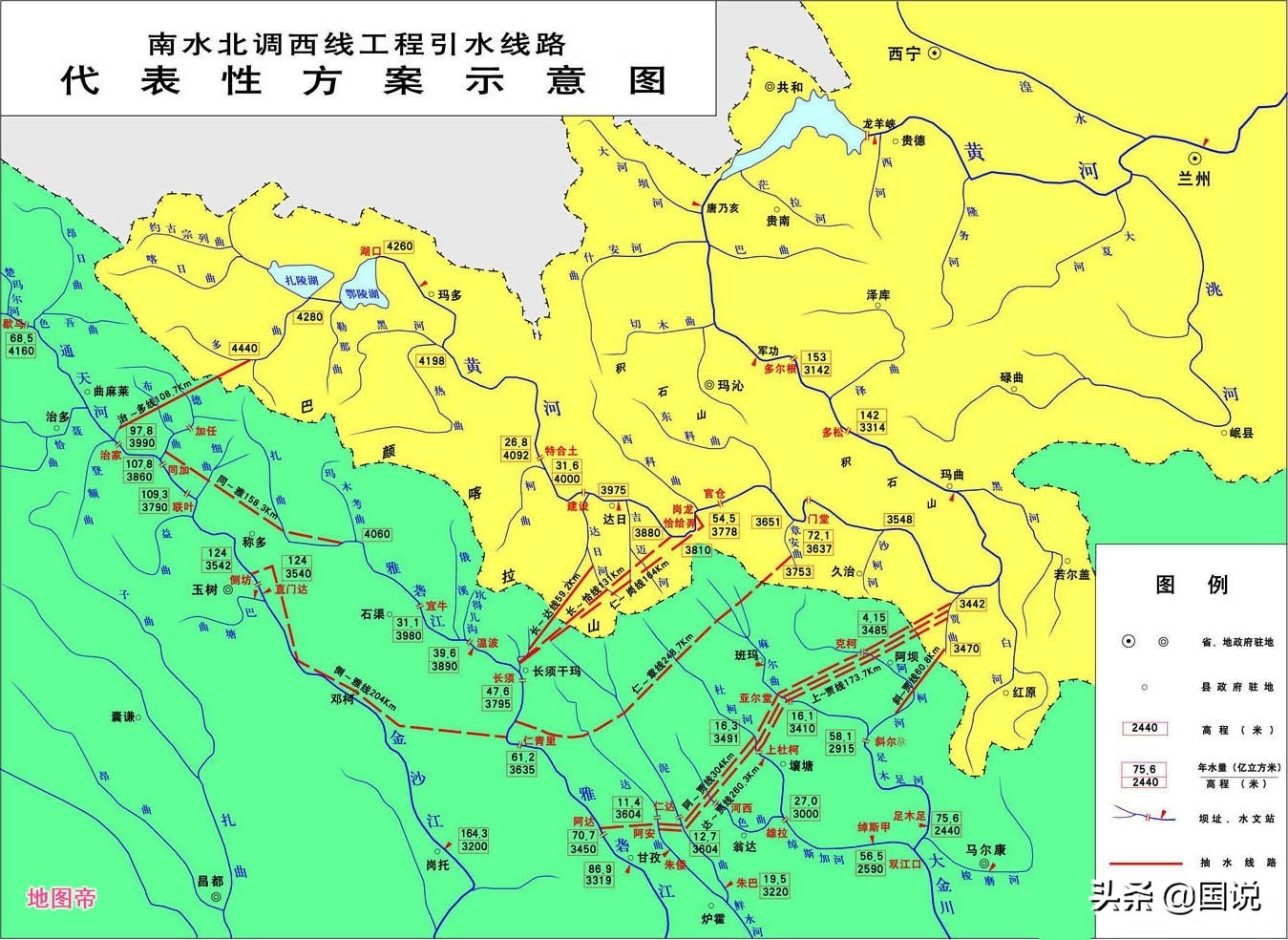 根据最新方案,从长江上游调集约240亿立方米水到黄河上游。水利部门通过长期研究和勘察,已形成‘上线’和‘下线’两条线路共存的方案(如上图所示)。绿色‘下线’从金沙江叶巴滩水电站、雅砻江两河口水电站、大渡河双江口水电站调水入黄河支流洮河,调水约160亿立方米;蓝色‘上线’从雅砻江、大渡河干支流调水至贾曲河口入黄,调水约80亿立方米。两条线路以引水洞涵为主,均可形成自流到黄河上游,分两期实施。