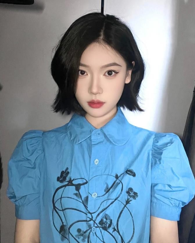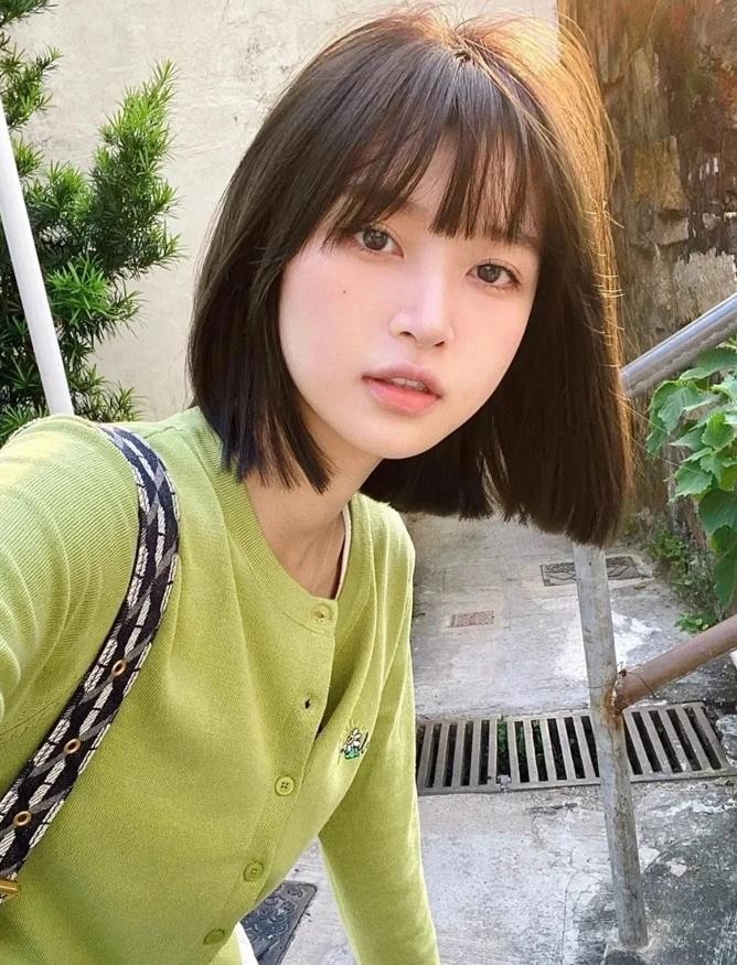 很喜欢的一款一刀切短发,看起来可甜可盐,选择轻薄的空气刘海来配,很好修饰了脸型轮廓,也减龄。不管是什么脸型都是可以试试看的,在搭配上,不管选什么服装来配都好看。
