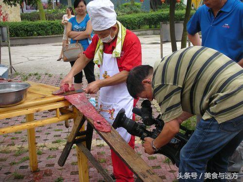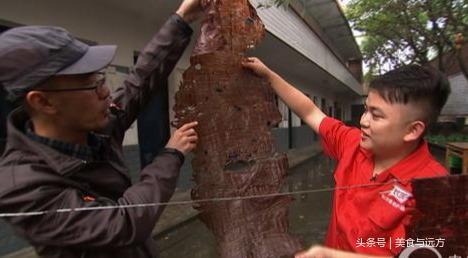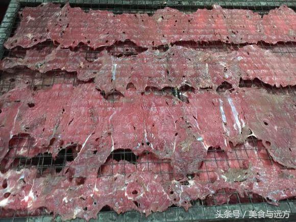 然后在上面抹上少许的盐和酱油,悬于通风处晾干,再摊在通气的篾巴上,用牛屎巴或干木灰徽火慢炕。据说牛屎巴炕的牛肉更有一种独特的清香。做成后的火边子牛肉,红亮透明,文字图案隔肉可见,最后涮上辣椒红油即成。